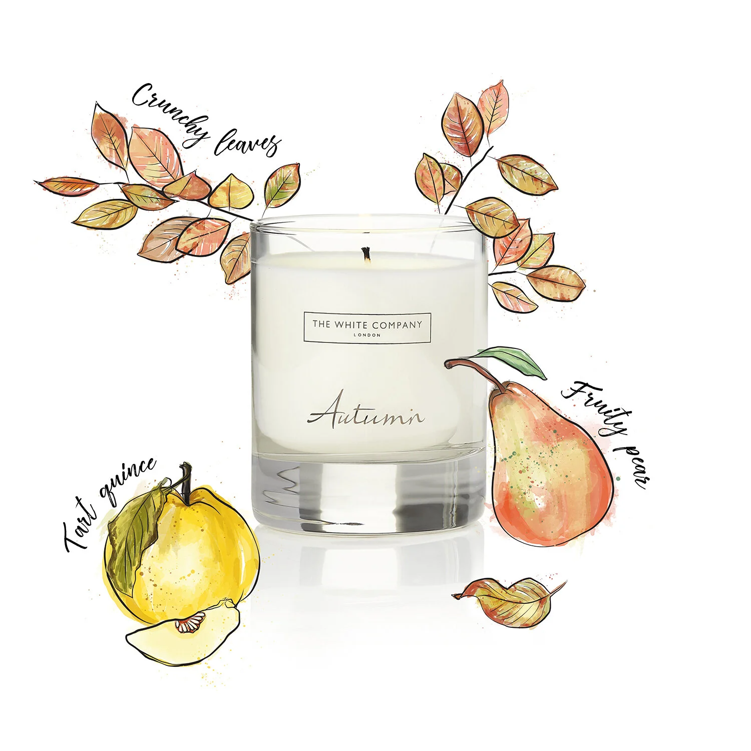 The White Company launched three new scented candles as part of their Autumn 2017 collection: Rhubarb, Autumn and Sandalwood. They commissioned Gal & Fellow to create illustrations juxtaposed with photographs of the products to highlight the notes that were used to create the scents. We decided on a hand-drawn, watercolour style to depict fruits, flowers and leaves around the candles.